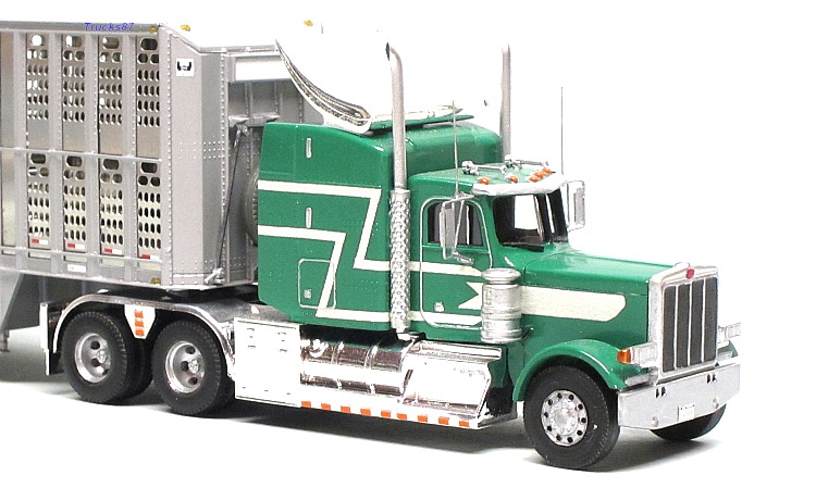 Peterbilt 359 - Fahrgestell und Schlafkabine der Zugmaschine von Herpa, geändertes Führerhaus von Wiking, geänderter Grill von Trucks N' Stuff, Räder von A-Line/Athearn; Viehtransportauflieger von Lonestar Models