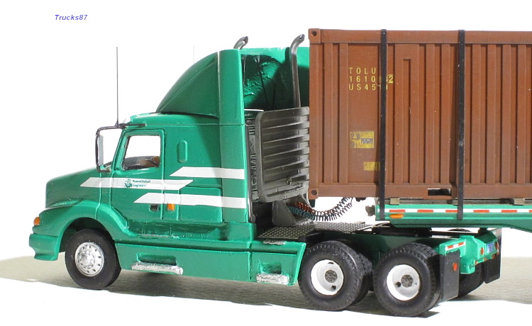 Volvo VNL420 - Fahrgestell von Herpa, Führerhaus von Jacobs Models (leicht überarbeitet), Räder von Boley und A-Line; 53 ft Auflieger aus zwei Plattformaufliegern von Promotex, Container von Herpa und B-models, Räder vom Stepvan von Atlas, Nassschieber von Decalprint (die Spedition ist fiktiv)